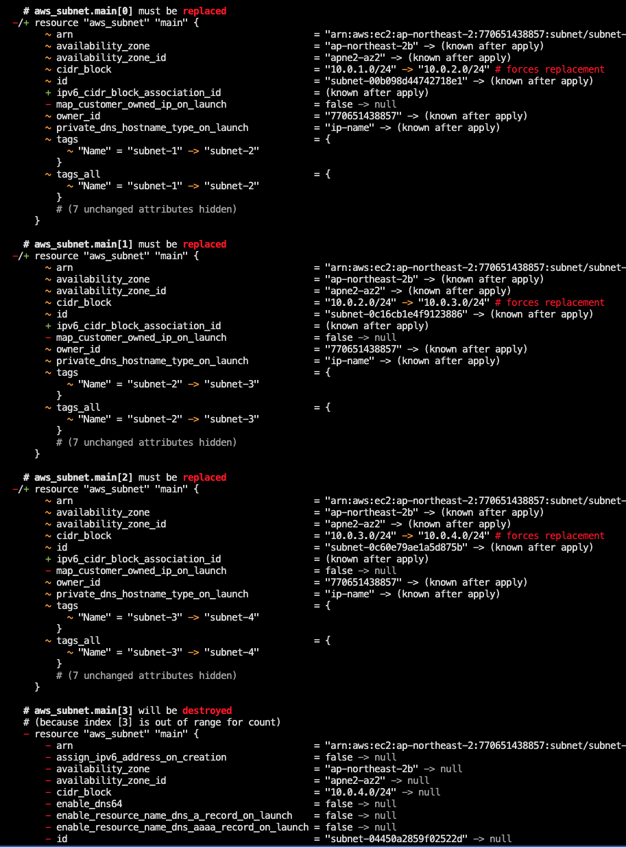 배열의 인덱스가 밀리게 되면서 aws_subnet.main[0] 뒤에 있는 서브넷들이 강제 재생성됩니다.