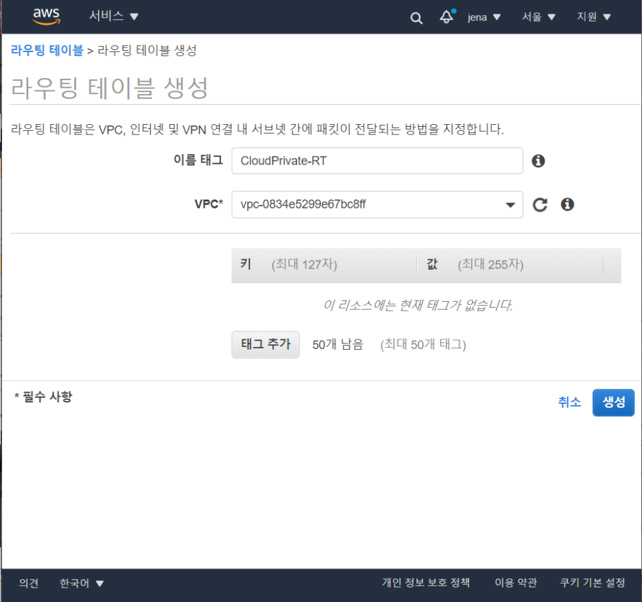 이제 라우팅 테이블에 가서 서브넷이 2개이므로 2개의 테이블을 만들어야한다.