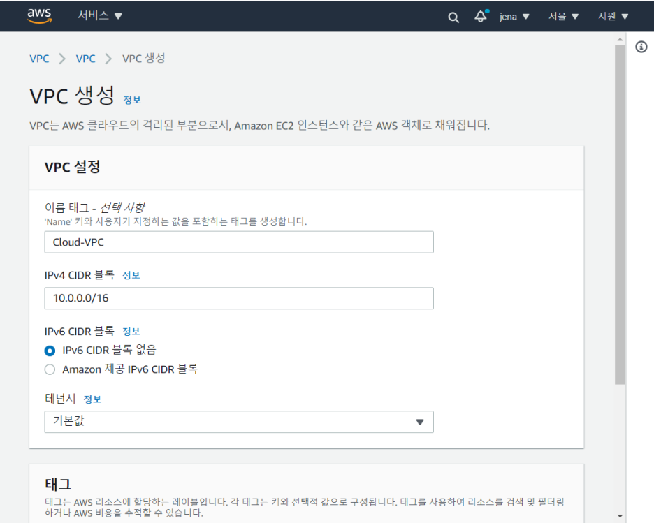 1. 사용자 지정 VPC만든다(10.0.0.0/16)
