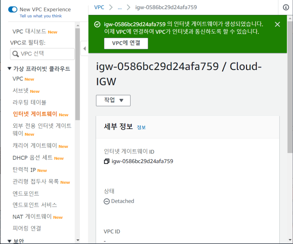 아까 만든 Cloud-VPC에 인터넷 게이트웨이를 연결하자