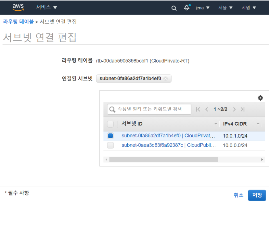 그다음 아래에 보이는 1. 서브넷 연결 2. 라우팅 설정을 해야한다.