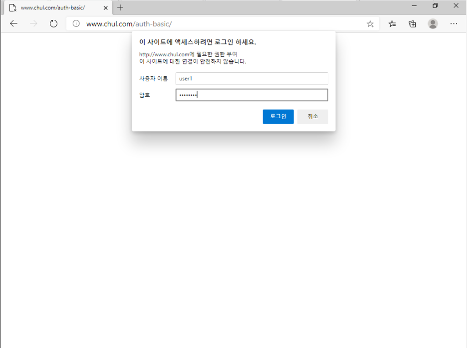 http://www.chul.com(or ip)/auth-basic 을 검색하니 인증 창이 뜬다!