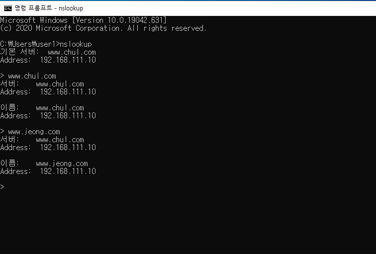 www.chul.com과 www.jeong.com에 ip를 확인, 아래와 같이 둘다 같은 ip가 나오면 준비가 끝났다.