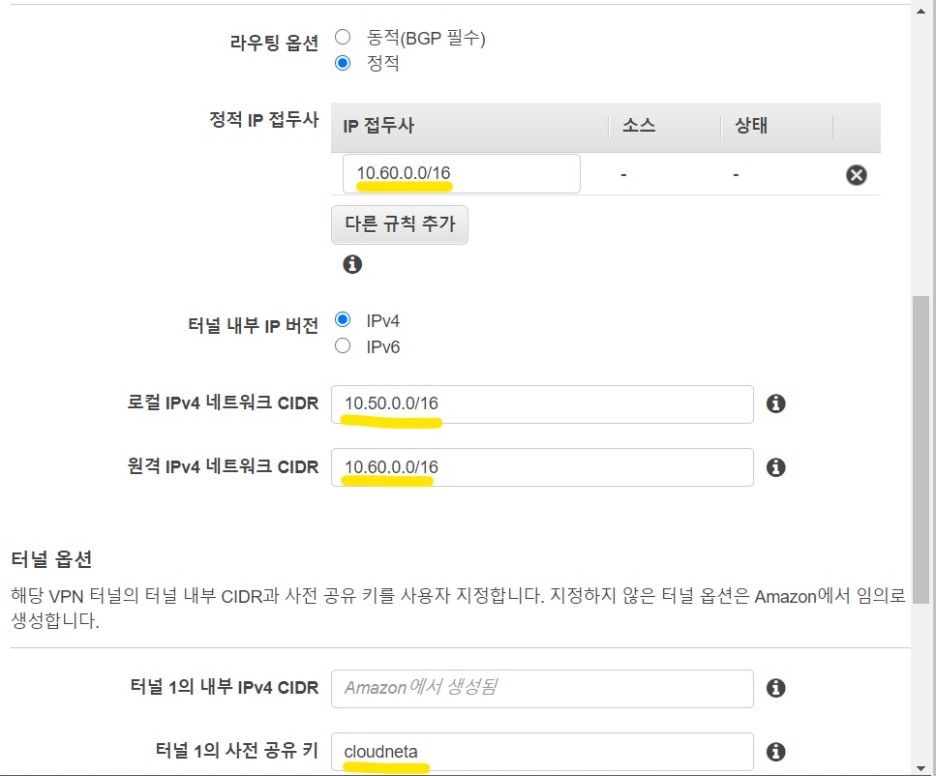 * 정적IP접두사: IDC-VPC IP