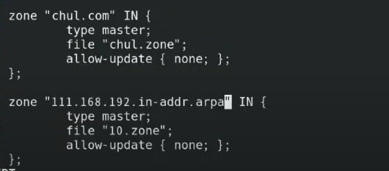 10.zone 은 ip를 입력했을 때 도메인으로 가기 위한 역방향 존정보입니다. 역방향이어야 하기 때문에 111.168.192.in-addr.arpa 이런식으로 아이피를 거꾸로 적어야 한다.