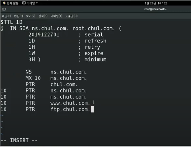 CNAME 레코드 : 도메인의 별칭을 지정. web IN CNAME www 과 같이 사용할 경우 web.chul.com. 을 서비스 할 때 www.chul.com. 으로 이동 됨.