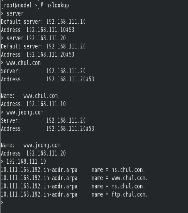 * chul.com은 마스터 웹서버존이고, jeong.com은 슬레이브 웹서버존이고 111.168.192.in-addr.arpa는 ip로 도메인을 찾는 역방향존이다.