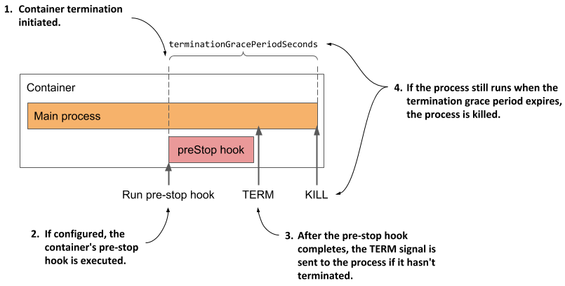 - 만약 종료 기간 이내에 종료되지 않는다면, Kubelet은 컨테이너에게 `SIGKILL` 시그널을 전송하여 강제로 종료시킬 것입니다.