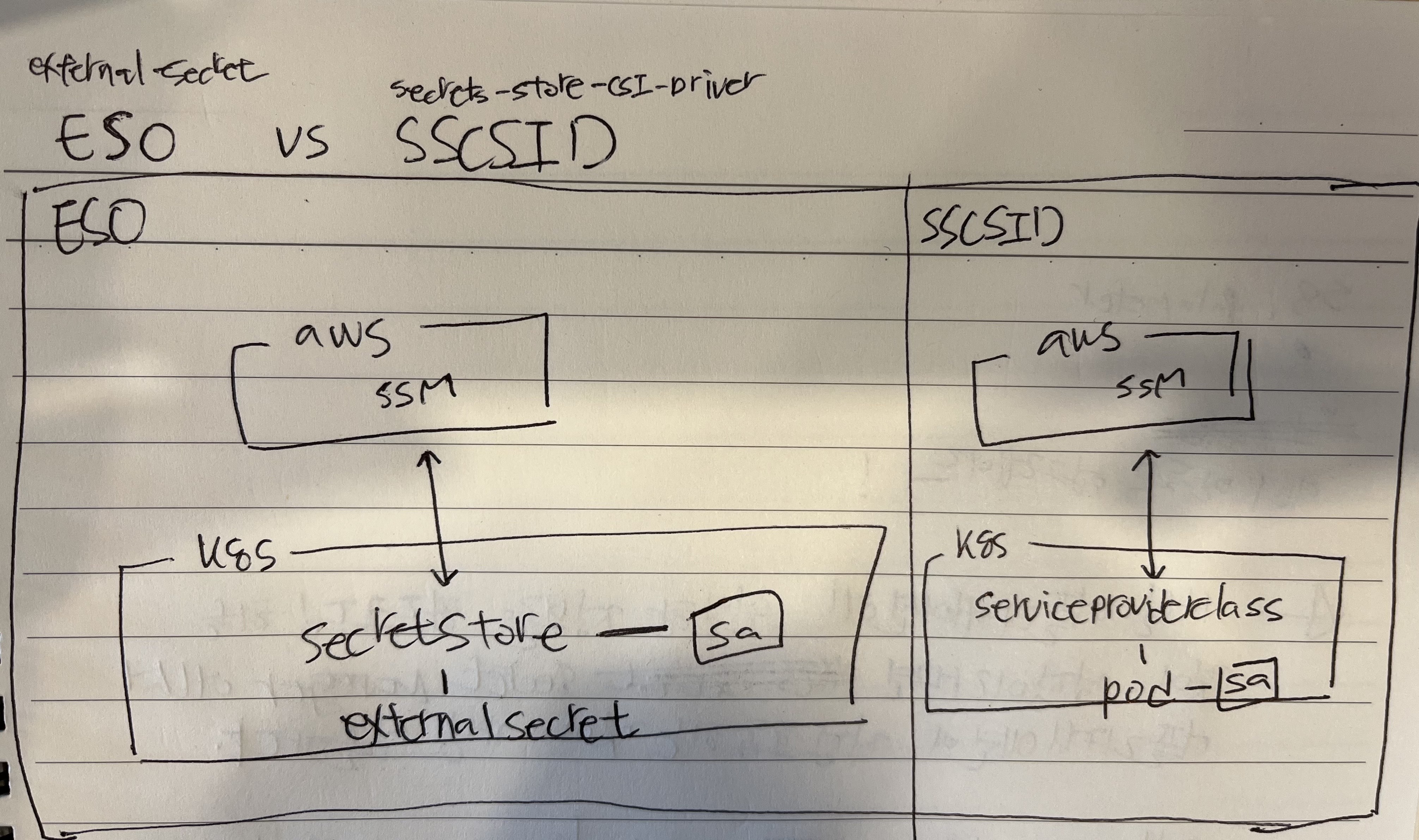 정리해보면, k8s secret을 생성하지 않고 pod에 간단하게 마운트하여 사용하려면 SSCSID을 선택합니다. 하지만 pod마다 ServiceAccount를 붙여야 하는 번거로움이 있습니다.