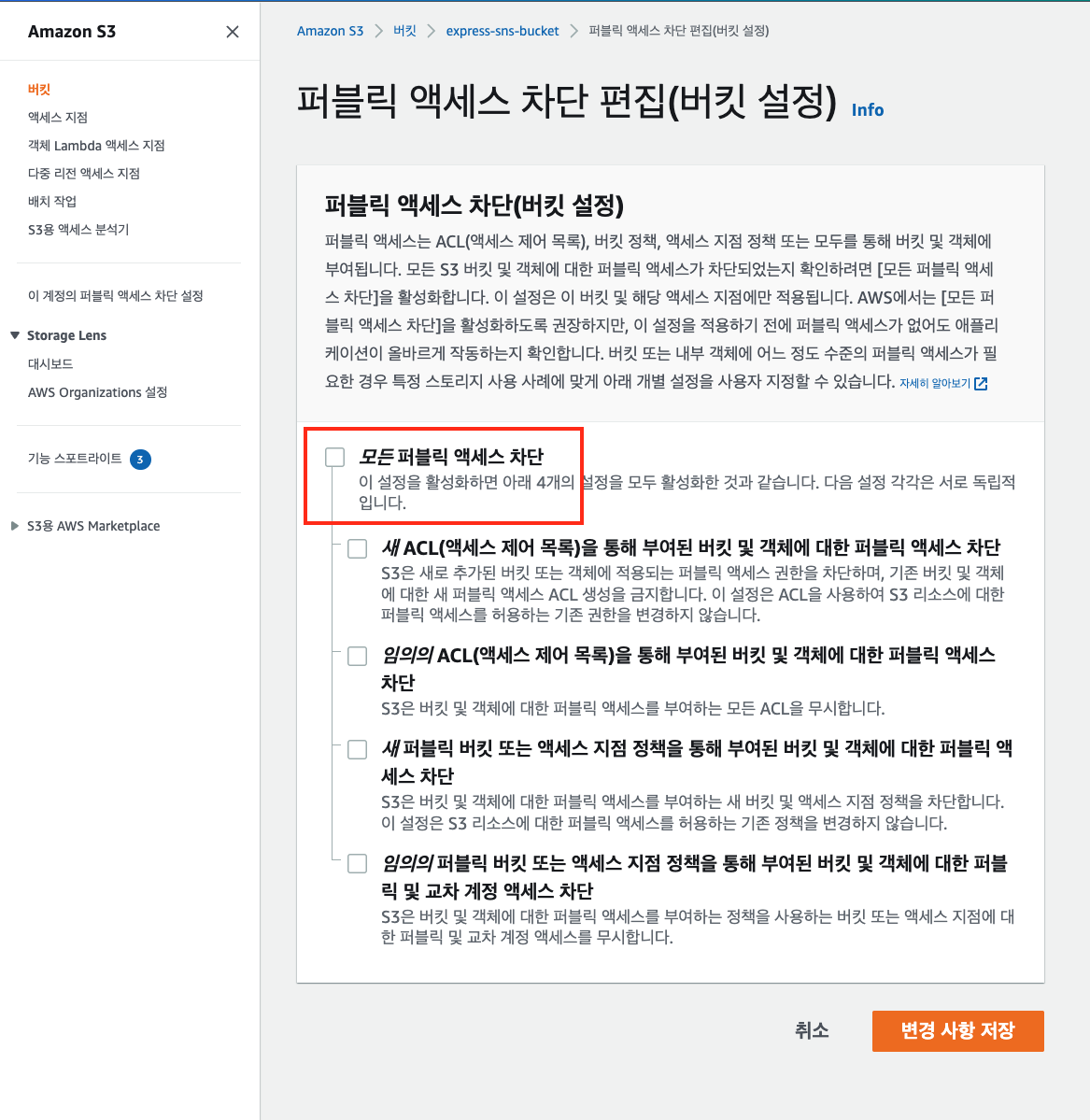 S3 > 권한 > 퍼블릭 엑세스 차단